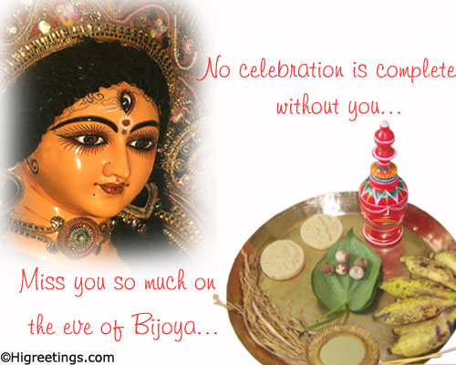 No celebration is complete without you. Miss you so much on the eve of Bijoya. Send your warm wishes to your family who is far away on Durga Puja. Pass your heartfelt messages through this Durga Puja greeting card to your loved ones.