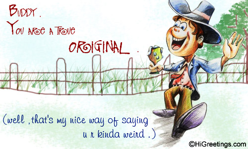 Buddy, You are truly original, well that my nice way of saying, you are kind of weird. A simply strait forward friendship fun ecard for your friend, to bring a smile on your friend's face from HiGreetings.com.