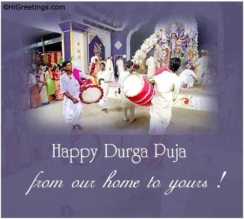 'Happy Durga Puja from our home to yours'. Pass on these wonderful lines to all your near and dear ones through this amazing free Durga Puja ecard, just from HiGreetings.com to all your family members and close friends.