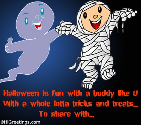Halloween is fun with a buddy like you, with whole lotta tricks and treats to share with. Pass on this perfectly significant greetings card to wish your beloved friend on this special day.
