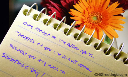 'Even though we are miles apart, thoughts of you are in full bloom, missing you very much on this sweetest day.' Pass on this great ecard to fill the gap between you and your lover who is miles apart from you, through HiGreetings.com.