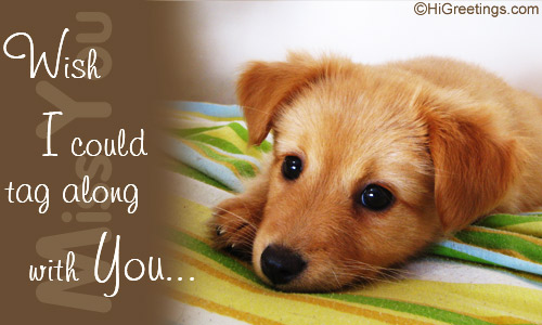 'Wish I could tag along with you...'- If this is what your heart feels then pass on this cute greetings card from HiGreetings.com featuring an adorable dog in it. Make your special friend or a dear one the soft corner for him/ her in your heart with this cute card.